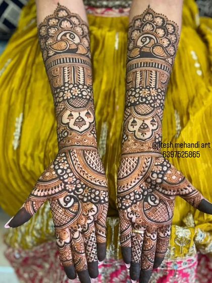 Hello, main Jitesh. Mehndi mera junoon hai, not just kaam. I feel every bride’s happiness when I draw on her hend (hand). Mumbai mera base hai, but I travel all over India, Hyderabad, Delhi, Bangalore - wherever you want, I’ll come. My mehndi is always 100% natural colour, and I promise your day will 'spark your 💥'. Jay shree ram!