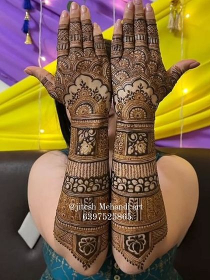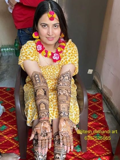Hello, main Jitesh. Mehndi mera junoon hai, not just kaam. I feel every bride’s happiness when I draw on her hend (hand). Mumbai mera base hai, but I travel all over India, Hyderabad, Delhi, Bangalore - wherever you want, I’ll come. My mehndi is always 100% natural colour, and I promise your day will 'spark your 💥'. Jay shree ram!