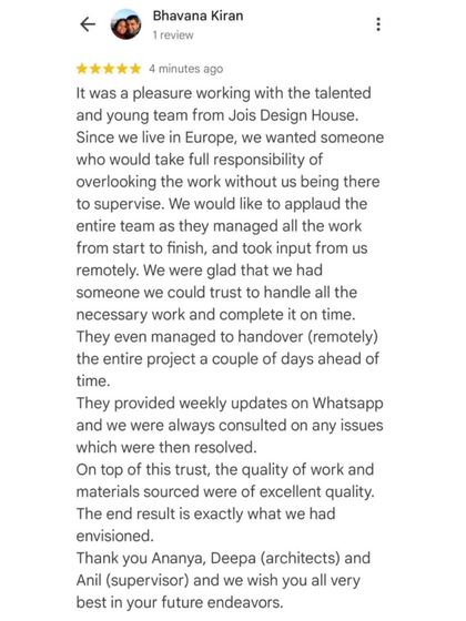 Jois Design House is a team of young, energetic architects and designers passionate about creating extraordinary homes. Led by me, Ananya Jois, we specialize in bridging the gap between a client's dream and practical, innovative design solutions.