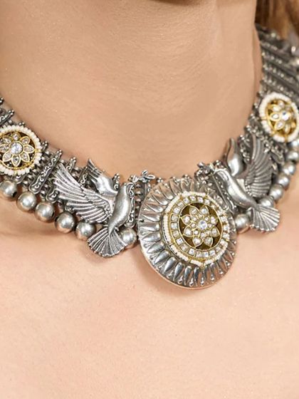 Inspired by ancient temple artistry and rustic tribal motifs, the Aalayaa collection features bold designs in oxidized silver. These pieces are for the woman who wears her heritage with modern confidence and is not afraid to make a statement.