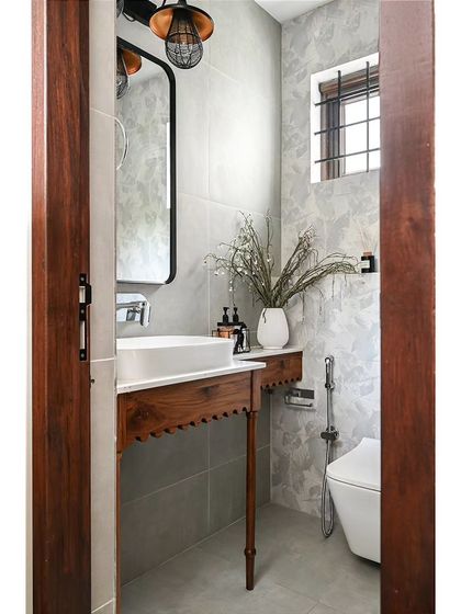 - Sanitaryware: Wall-hung concealed tank WC and countertop vessel basin.