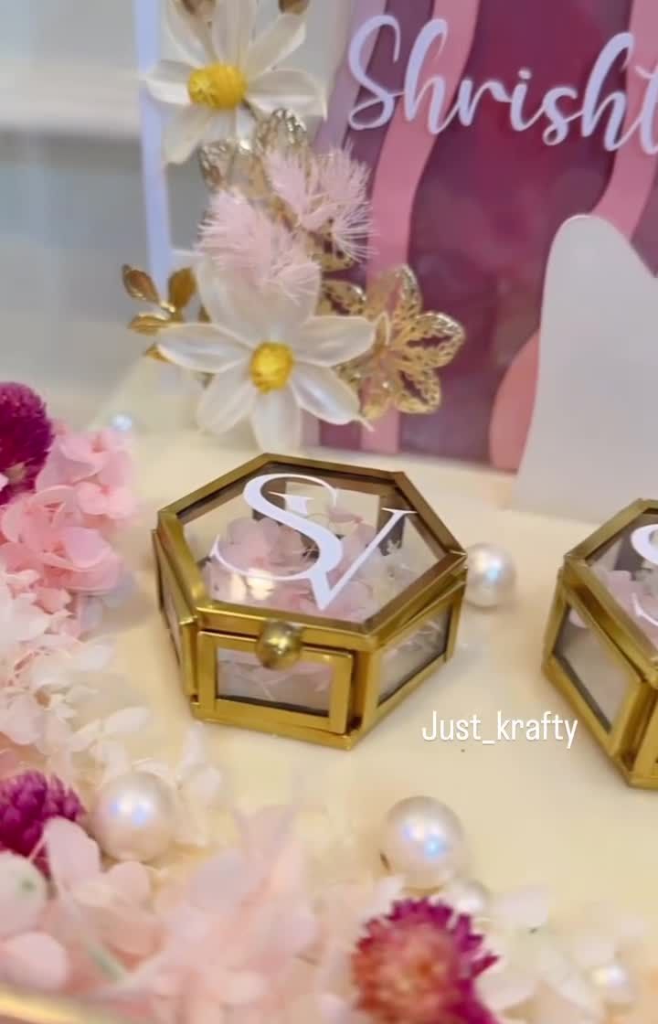 Let's create a miniature world for your rings. These clear acrylic boxes enclose a fully customized scene with flowers, personalized backdrops, and unique ring holders, protecting your platter while displaying it beautifully.
