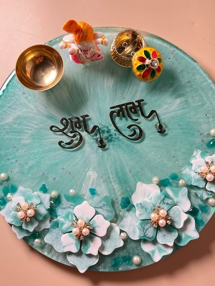 - Custom wedding resin keepsake like nameplates or pooja thalis