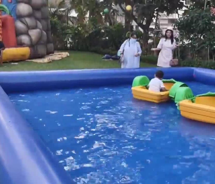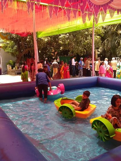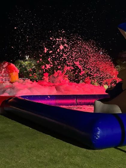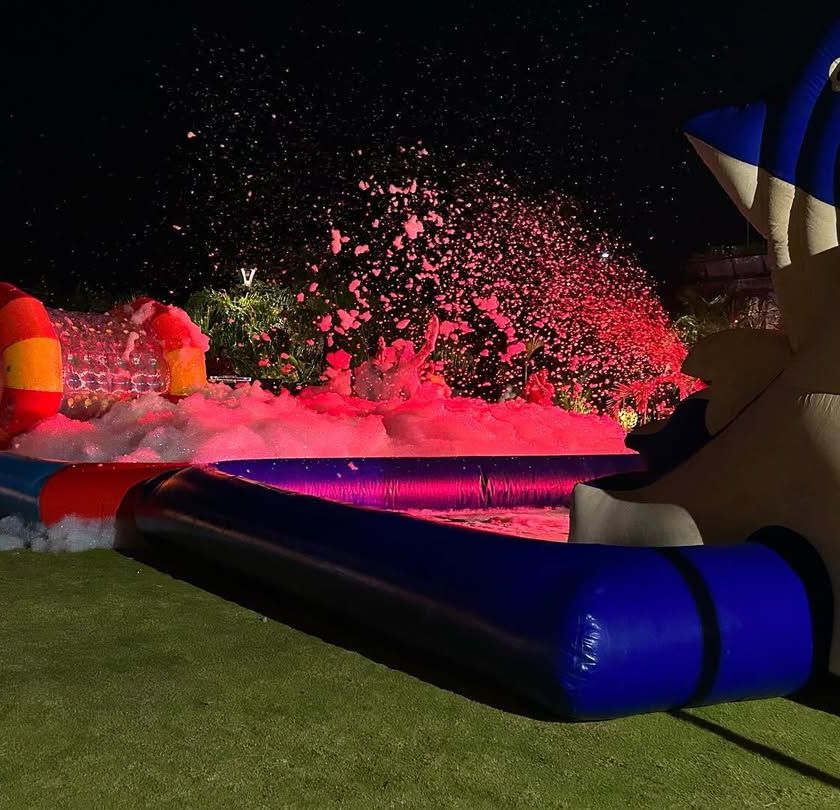 I bring a professional foam machine to fill an inflatable pool with safe, bubbly foam. This is a unique attraction for kids' parties in Mumbai and can be set up for both day and night events.