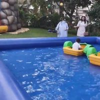 I provide large inflatable pools that can be used for simple water play or combined with other activities. I also offer kid-powered paddle boats and giant water zorbing rollers for extra fun.