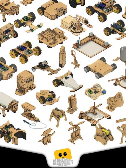 - Includes laser-cut wooden structural parts, motors, and fasteners.