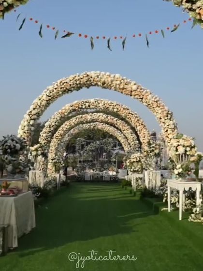 - Large-scale floral installations including entrance arches and ceiling suspensions.