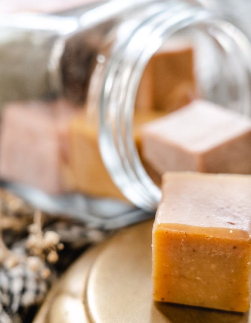 I create cold-processed soaps using organic oils, butters, natural clays, and herbs. You can find everything from goat's milk bars and coconut milk soaps to assorted sampler cubes in a jar.