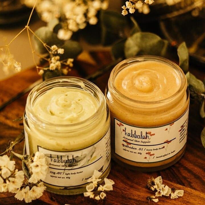 My body butters, yogurts, and lotions are made with ingredients like shea butter, aloe, and chamomile. I offer different textures, from the rich 'gulbadan' heavy butter to the light 'makhmal' lotion.
