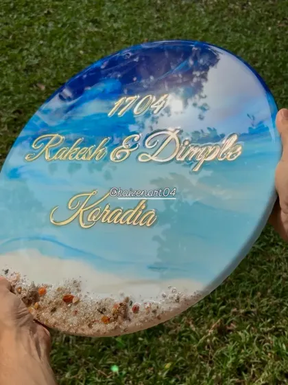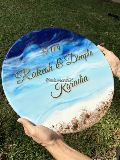 I create personalized resin artworks including wall clocks, nameplates, engagement ring platters, and decorative pieces. My specialty lies in ocean-themed designs that mimic waves using advanced resin techniques.