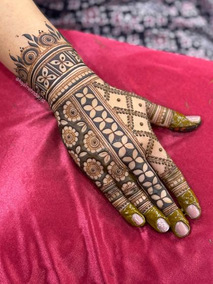 This is my specialty, where I pour my heart into creating dense, bold, and detailed designs. From fingertips to full arms, I love crafting intricate patterns that make every bride feel like a queen on her big day.