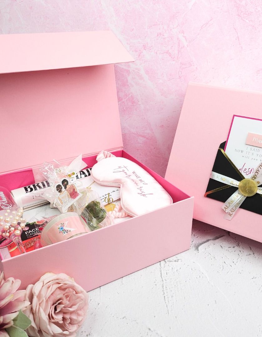 I create everything from bridesmaid proposal boxes to luxurious trousseau packing. Each hamper is curated with personalized goodies like robes, tumblers, and jewelry cases, all designed to make your wedding journey unforgettable.