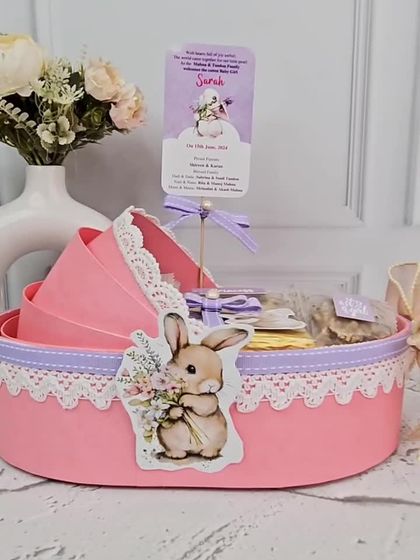 I design themed gifts to make every party and announcement feel special. From adorable cradle baskets and custom rompers for baby showers to personalized birthday hampers and unique favors, I can help you create a memorable gift for any milestone.
