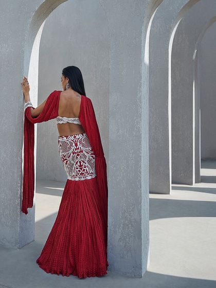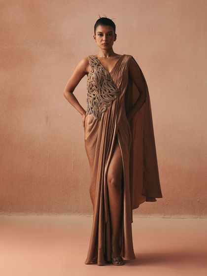 I design gowns and saris that merge traditional grace with architectural precision. These pieces feature pre-stitched drapes for effortless wear, sculpted hoods for dramatic effect, and silhouettes like the fish-cut that are tailored to the body, creating a seamless blend of structure and fluidity.