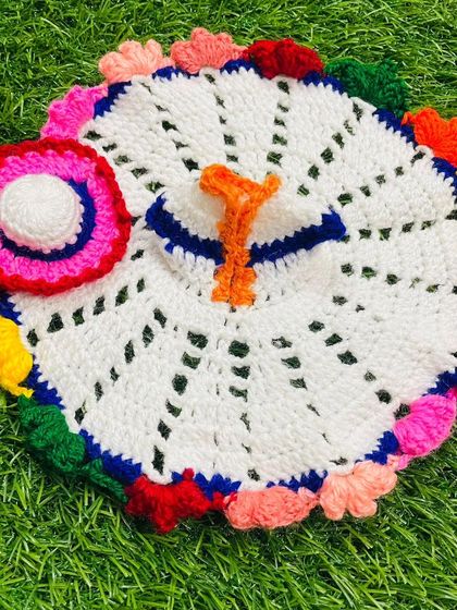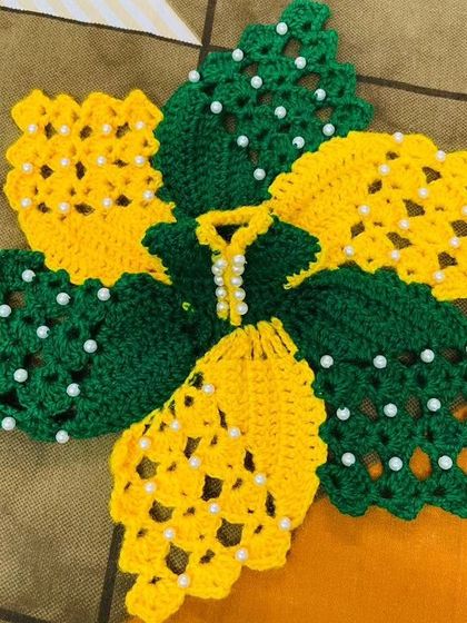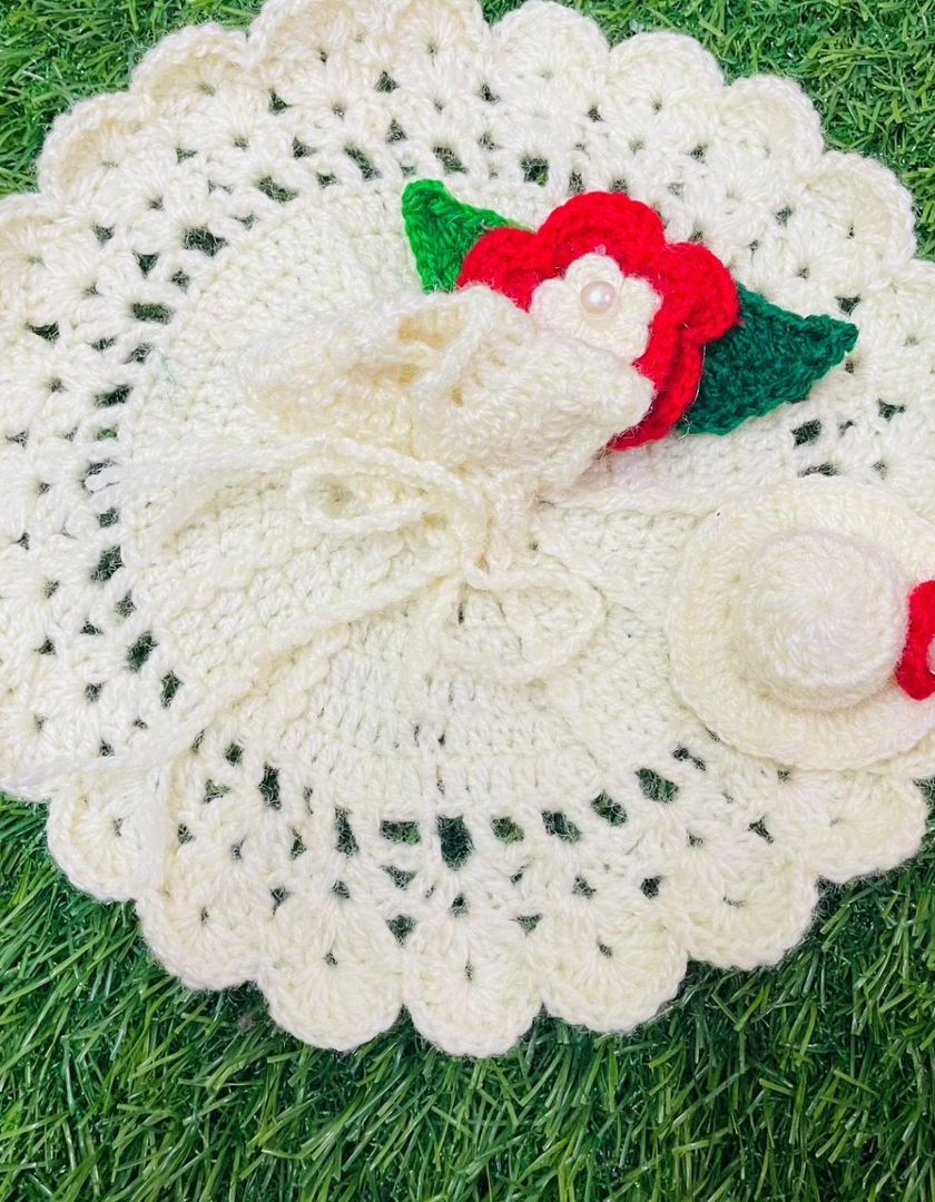 A collection of poshak adorned with delicate crochet flowers, from tiny roses to sunflowers. I offer these in various styles, including pearl-studded leaf patterns and simple, elegant single-flower designs.
