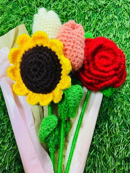 I create handcrafted crochet flowers including roses, sunflowers, daisies, and tulips using vibrant colors and intricate patterns. Each flower is meticulously crafted with detailed crochet work, perfect for decorative purposes, bouquets, and floral arrangements.