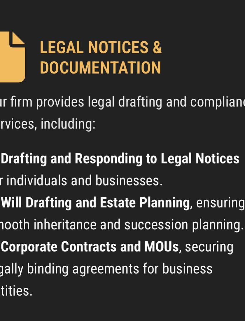 The best way to prevent future property disputes is with clear, legally sound documentation. I specialize in drafting wills, estate plans, and legal notices that safeguard your assets and ensure your wishes are honored.