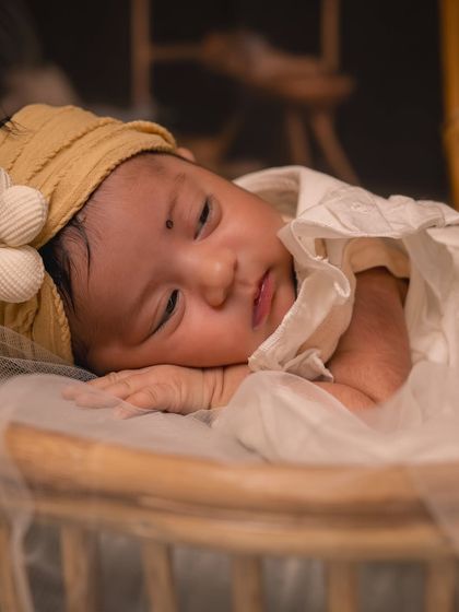 - Styled newborn portraits done indoors, with soft wraps and rustic props - comfy for baby, soothing for parents.