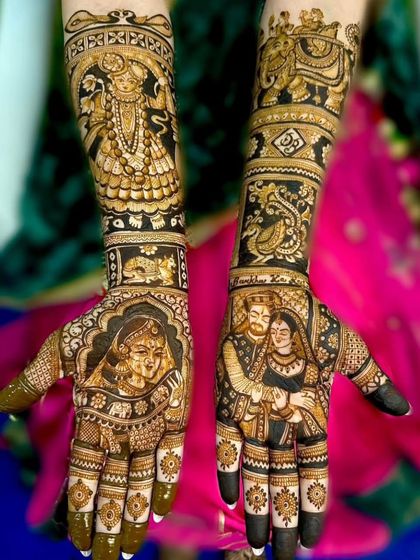 I do bridal mehendi at your home with organic henna, guarantee dark colour, and can add custom portraits or story designs as you want.