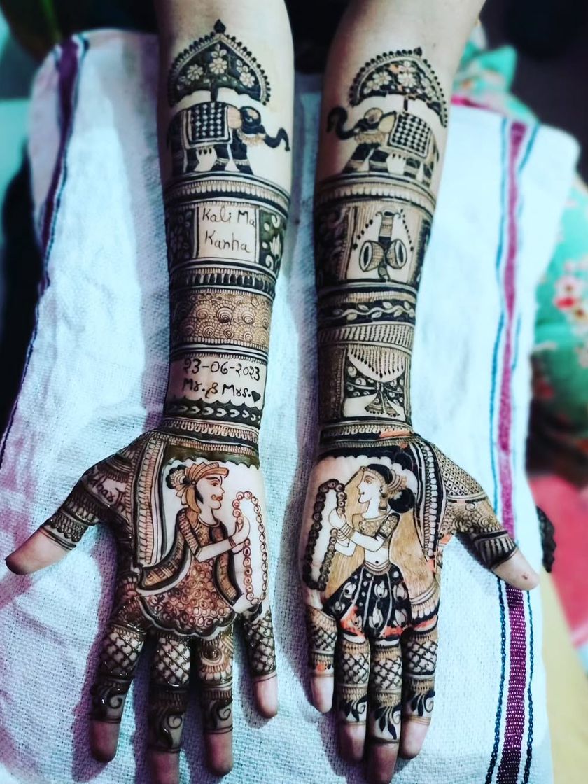 I specialize in creating detailed, realistic portraits for your special day. This cluster showcases examples of groom portraits, couple portraits, and other figure work. I can capture likenesses from photos to make your mehendi truly one of a kind.