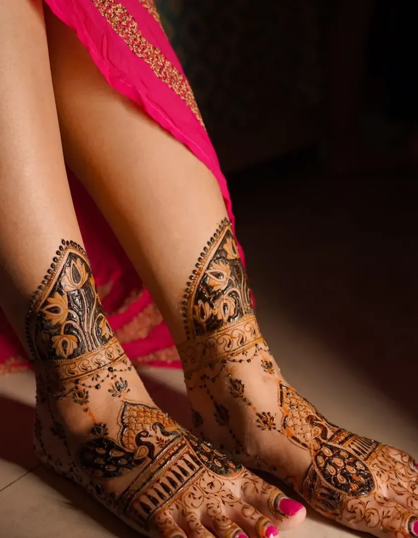 Complete your bridal look with beautiful mehndi for your feet and legs. I create designs that range from simple and elegant to full, intricate patterns that match your hand mehndi. I ensure the design complements your footwear and looks stunning in your wedding photos.