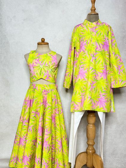 - Print Matching: Identical eclectic prints (polka, abstract, tropical) used for both siblings for visual coordination.