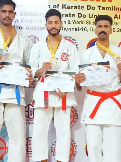 As a coach, I lead by example by actively competing at the state and national levels. These are moments from my own journey on the tatami, including winning medals at the AISKU National and Tamilnadu Shito-Ryu championships.