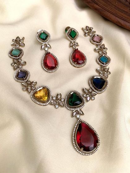 - Necklace: Brass alloy base with high polish finish (Gold, Rose Gold, or Rhodium). Features American Diamond (Zircon), semi-precious colored stones, or basic glass Kundan. Fastens with adjustable dori or chain hook.