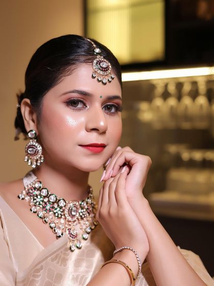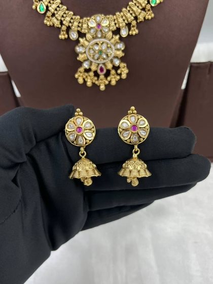 - Design Themes: Antique Temple jewelry (Elephant/Peacock motifs) or Layered Kundan styles with pearl/bead drops.