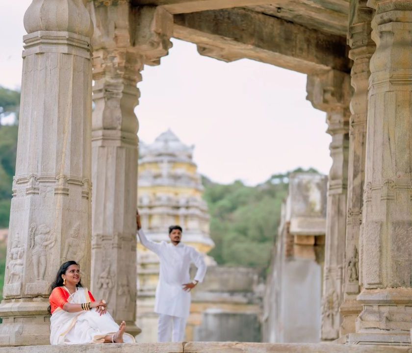 I love using the timeless beauty of heritage sites and ancient temples, like those in Melukote, as a backdrop. These shoots blend traditional attire with majestic architecture for photos that feel both grand and deeply personal.
