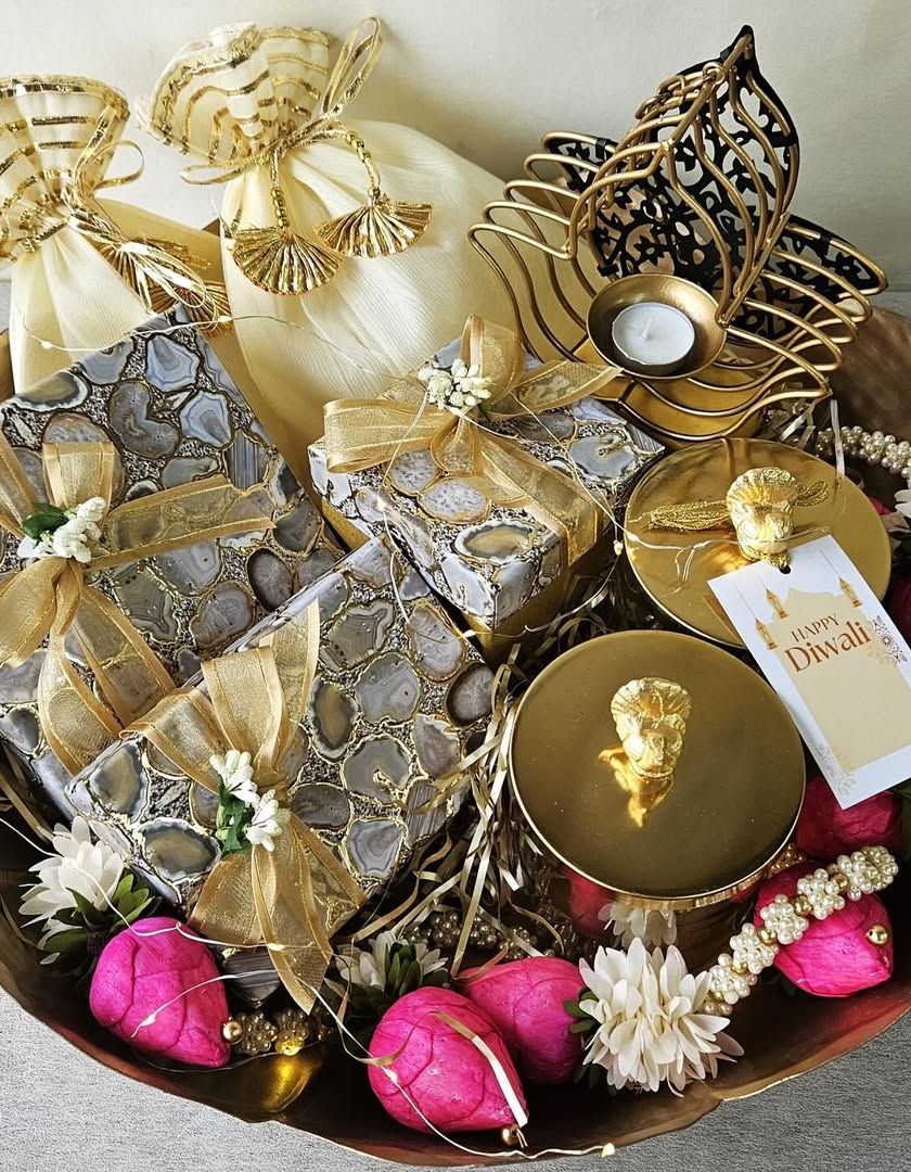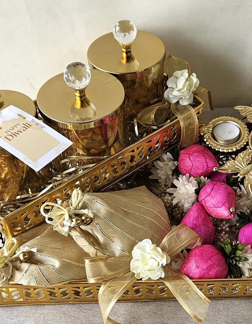 I believe Diwali gifting should be a memorable experience, filled with light and luxury. My collection features a wide variety of hampers, from grand metal baskets and elegant birdcage stands to chic acrylic bags, all filled with gourmet treats, handcrafted diyas, and premium decor.