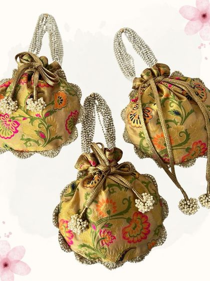 I believe the right accessory can complete a look, and my collection of handcrafted potlis, pouches, and clutches is designed to do just that. Made from luxurious fabrics like brocade and silk, and adorned with pearls, tassels, and embroidery, each piece is a celebration of color and craftsmanship.