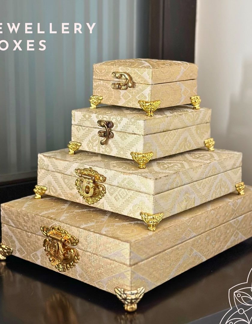 I design my jewellery and trousseau boxes to be more than just storage; they are treasure chests for your most cherished pieces. From large brocade trunks for sarees to small, elegant boxes for your precious gems, each one is handcrafted with care to protect and display your collection beautifully.