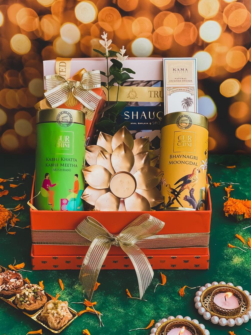 My festive collection offers a range of luxurious gifting options, from signature gift boxes filled with gourmet Indian sweets and savories to sustainable cane baskets. I curate each hamper with items like brass diyas, idols, premium dry fruits, and artisanal chocolates to make your festive gifting memorable.