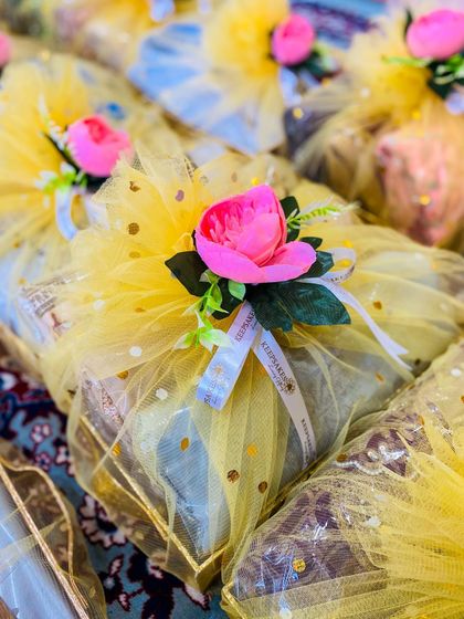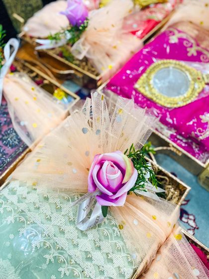 We specialize in creating luxurious wedding gift hampers and trousseau packing services. Our offerings include customized wedding gifts, Sagan and Roka favors, bridesmaid/groomsmen hampers, and wedding guest favors.