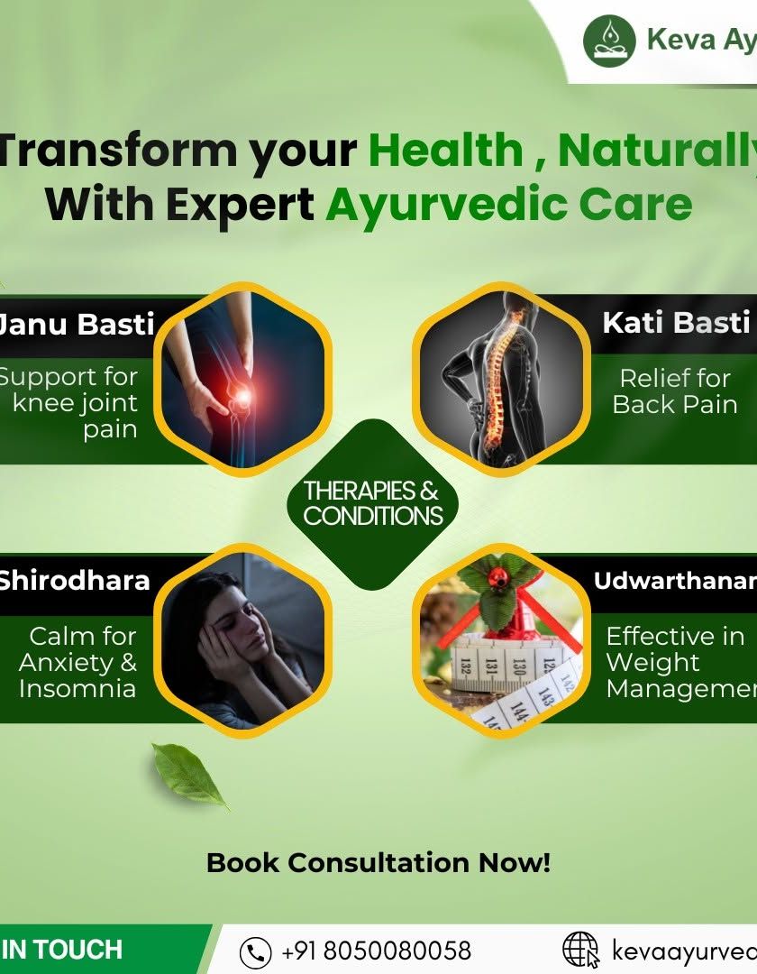 We offer specialized therapies to address specific concerns. This includes treatments like Kati Basti for back pain, Janu Basti for knee pain, Shirodhara for anxiety and insomnia, and Nasyam for sinus and headache relief.