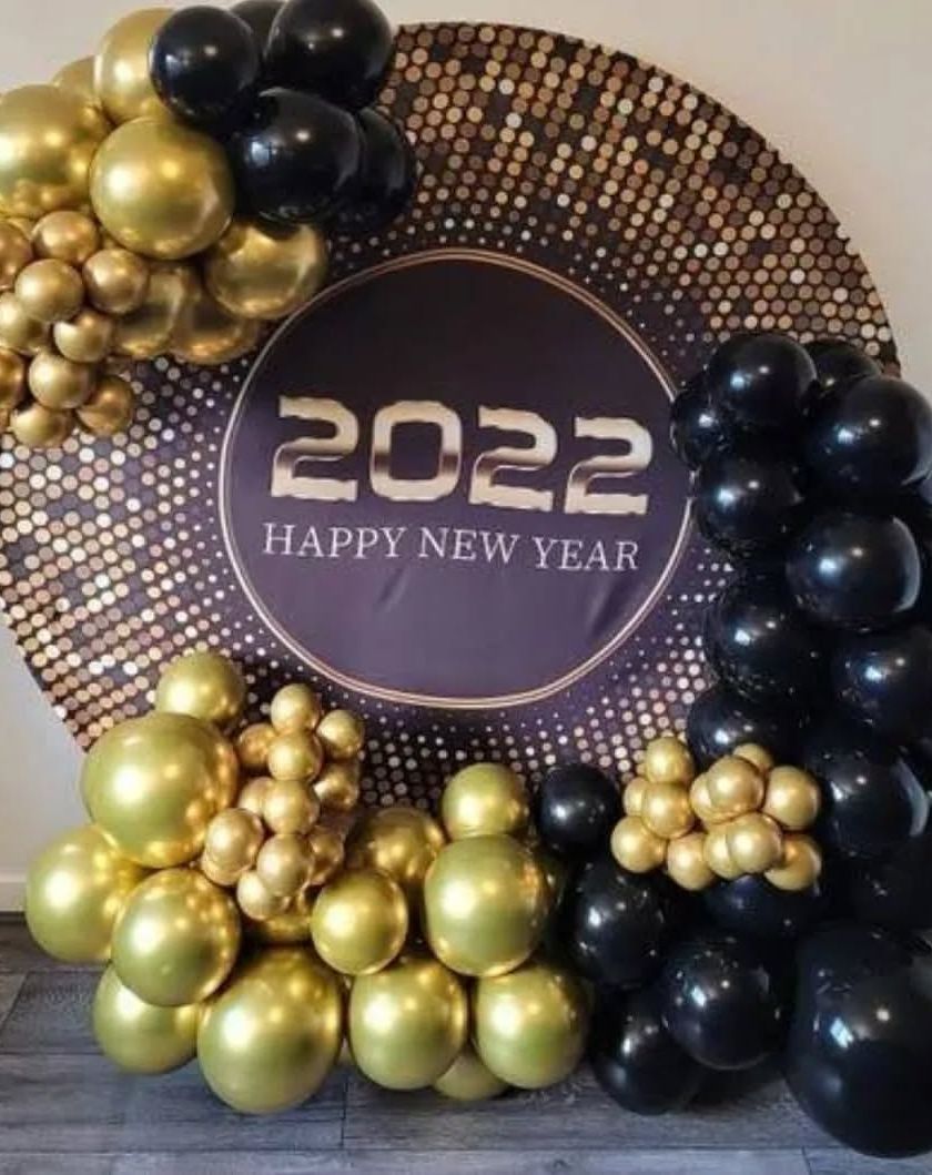 I create stunning backdrops for your New Year's Eve parties, perfect for photos. My service includes popular setups like large foil number balloons for the year, metallic fringe curtains, and circular backdrops with custom text, often using glamorous gold, black, and white color combinations.