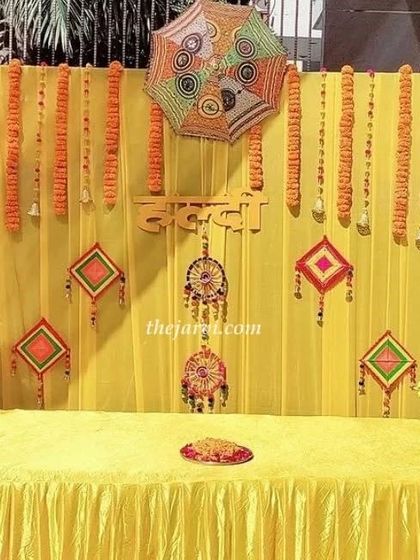 Haldi ka scene is all about bright yellows and oranges. I use genda phool strings, green leaves, and drapes to get that vibrant haldi decor going. If you want something extra, I add phulkari umbrellas, hanging bells, or even tassels - it’s all flexible depending on your space.