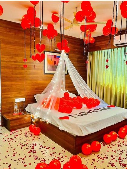 For that pre-wedding surprise or first night, I can decorate rooms with heart-shaped balloons, rose petals, fairy lights, and LED candles. Helium balloons on the ceiling make it look dreamy.
