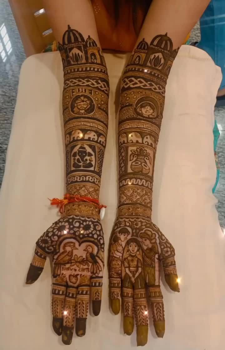 For brides who love classic beauty, I create dense, elaborate designs filled with traditional motifs. This includes popular elements like peacocks, elephants, lotus flowers, and Ganesha figures, all drawn with fine, clean lines for a stunning result.