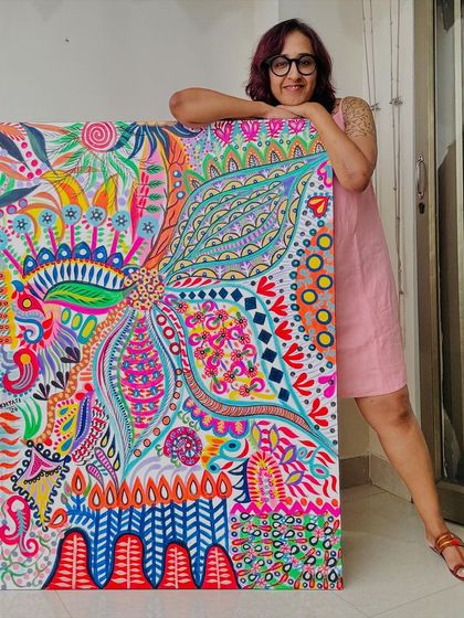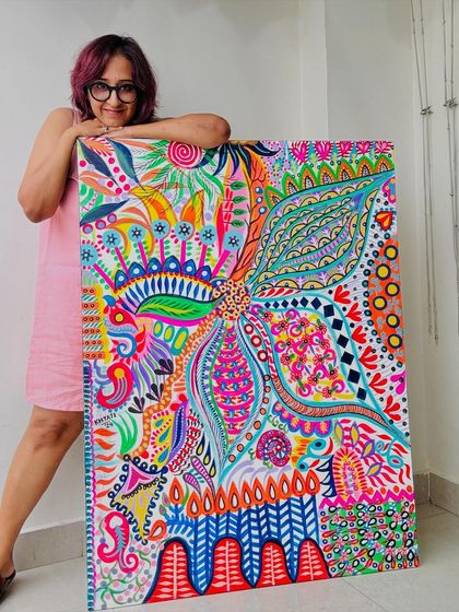 Hey, I’m Khyati. People call me the ‘psychedelic soul in a corporate world’ – IT by day, colors by heart. My house is my studio, and life’s messy with my daughter, Chiku (doggo sweetheart), and Bingo (crazy pup). I paint, I create, I juggle. If you’re after beige, sorry boss, not my jam. I make art for folks who vibe with joyful chaos. Real emotion, real mess, real color – that’s me.