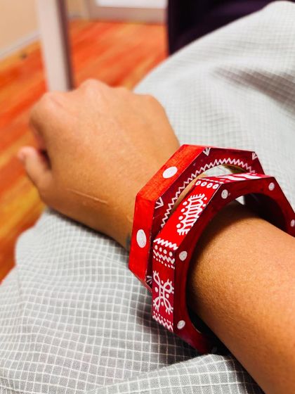 - My signature? Hand-painted wooden bangles. Every bangle is a statement - some are covered in my original artwork, others wrapped in fabric, and then tricked out with beads, sequins, or crazy metal charms.