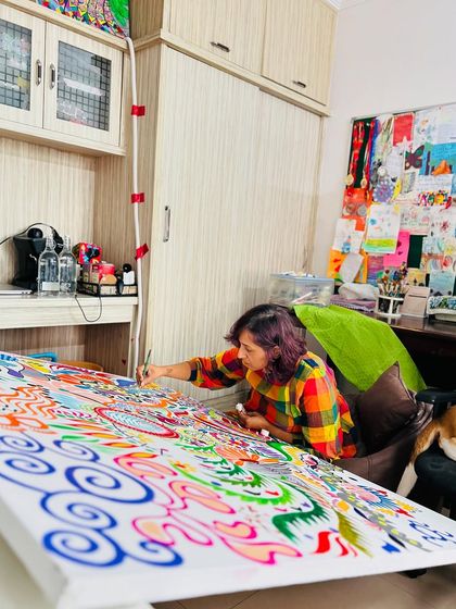 Hey, I’m Khyati. People call me the ‘psychedelic soul in a corporate world’ – IT by day, colors by heart. My house is my studio, and life’s messy with my daughter, Chiku (doggo sweetheart), and Bingo (crazy pup). I paint, I create, I juggle. If you’re after beige, sorry boss, not my jam. I make art for folks who vibe with joyful chaos. Real emotion, real mess, real color – that’s me.