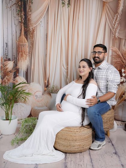 I do relaxed maternity shoots in Shimla studio or outdoors, with options for solo, couple, or family photos, lots of props and gowns, and I guide you for natural poses even if you’re camera shy.