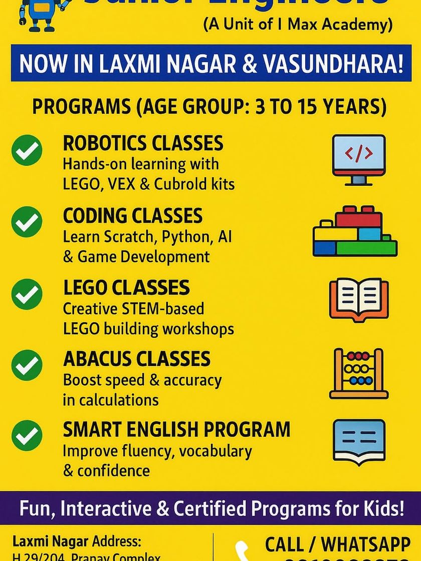 We offer a wide range of STEM and developmental programs for ages 3-15. This includes our core offerings of Robotics, Coding, and LEGO, as well as foundational skill-building courses in Abacus, Vedic Maths, and Smart English through our I-Max Academy brand.