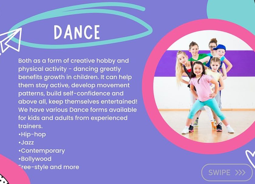 We offer a variety of dance styles including high-energy Bollywood, modern Hip-hop, and creative Freestyle. Our classes focus on building confidence and technique in a fun, supportive studio environment, whether your child is a beginner or has previous experience.