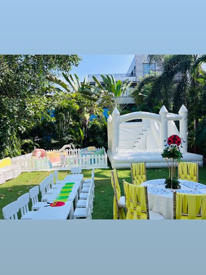We transform spaces into magical wonderlands through our themed party setups. Our offerings include customized play areas with white ball pools, double slides, bouncy castles, and themed decorations like our popular dino-themed setup.
