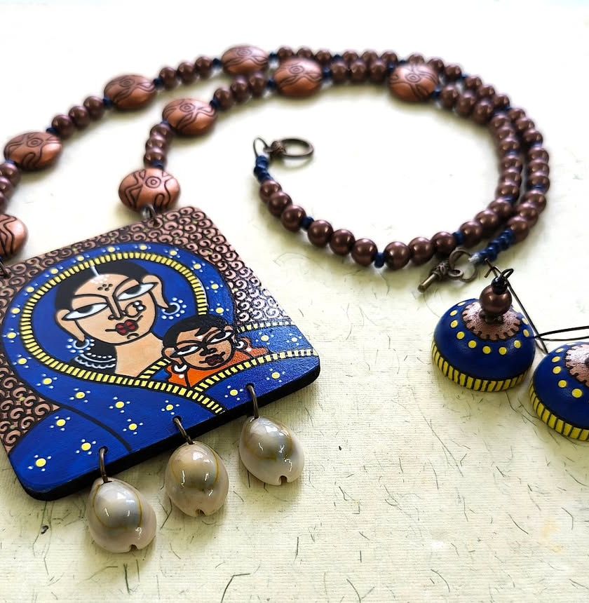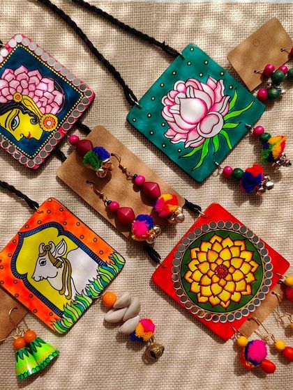 My art is also inspired by the beauty of everyday life, nature, and folklore. This collection features hand-painted jewellery with themes of motherhood, Pichwai-inspired cows, serene lotus flowers, and graceful women, all brought to life with colourful details and unique embellishments.
