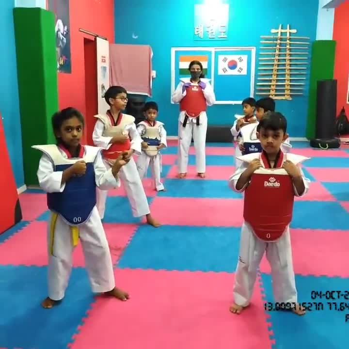 Here, you apply your skills. Kyorugi is controlled sparring where you learn to manage distance, timing, and strategy against a live partner. We always use full protective gear, including chest guards (hogu) and headgear, to ensure training is safe and effective.