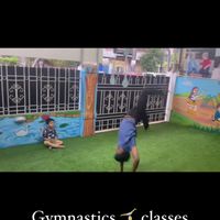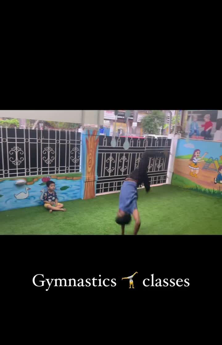 I use our outdoor artificial turf area to give kids more space for dynamic movements like cartwheels and handstands. This setup helps build confidence for bigger movements in a fresh, open-air environment.